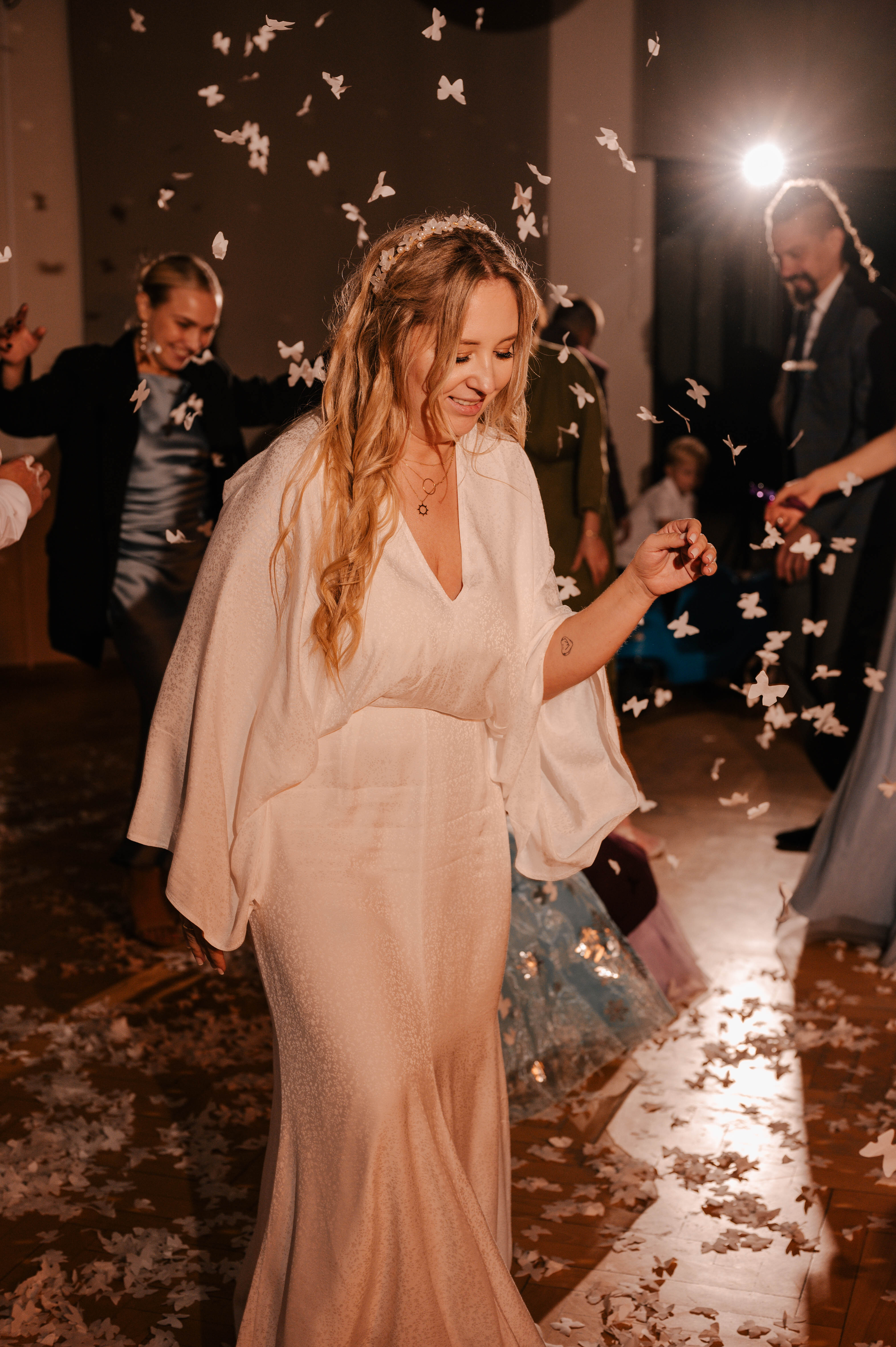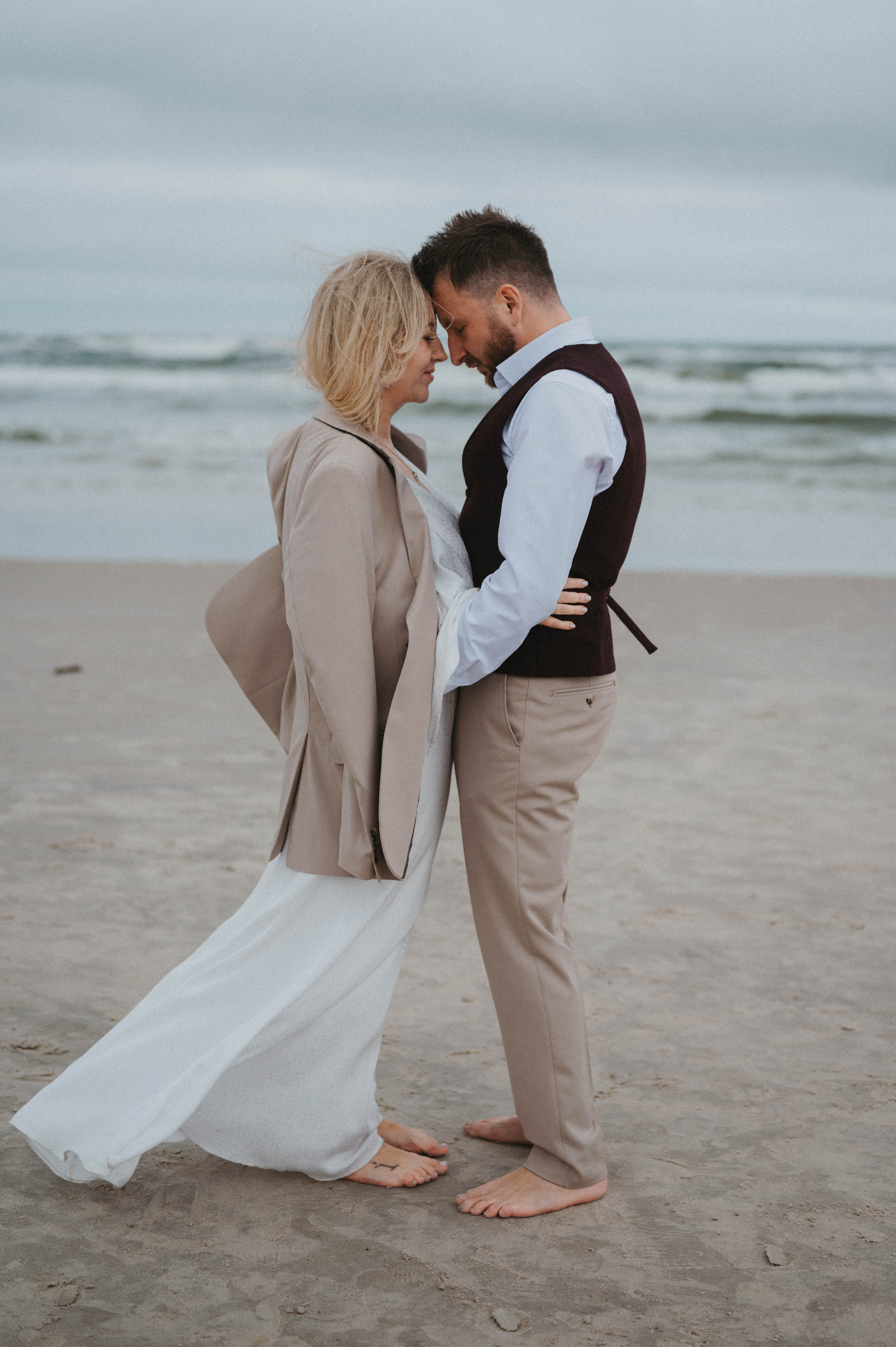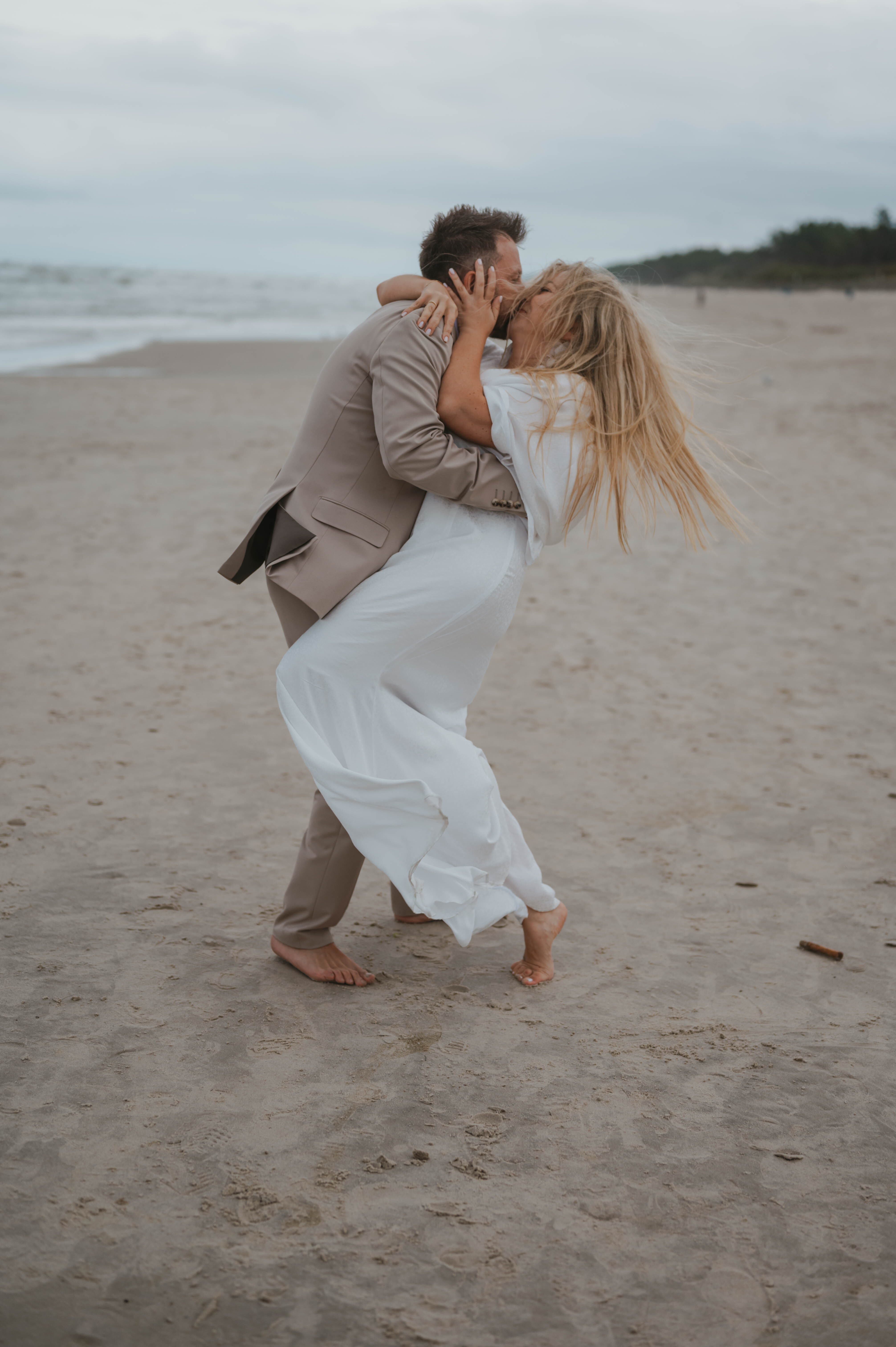 W teorii: warunki nie do zdjęć. Pochmurno, zimno, ludzie w zimowych kurtkach, a Justyna — na boso, w sukni ślubnej, tańcząca z falami.